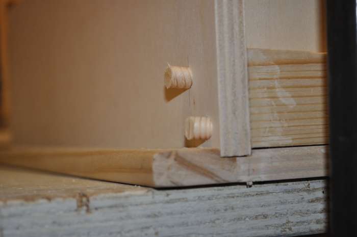 De proppen zet ik vast met houtlijm. Na ongeveer 5 minuten is de lijm hard genoeg om de proppen, gelijk met de zijkanten af te zagen. Ze vallen dan ook haast niet meer op, zeker niet van een afstand.